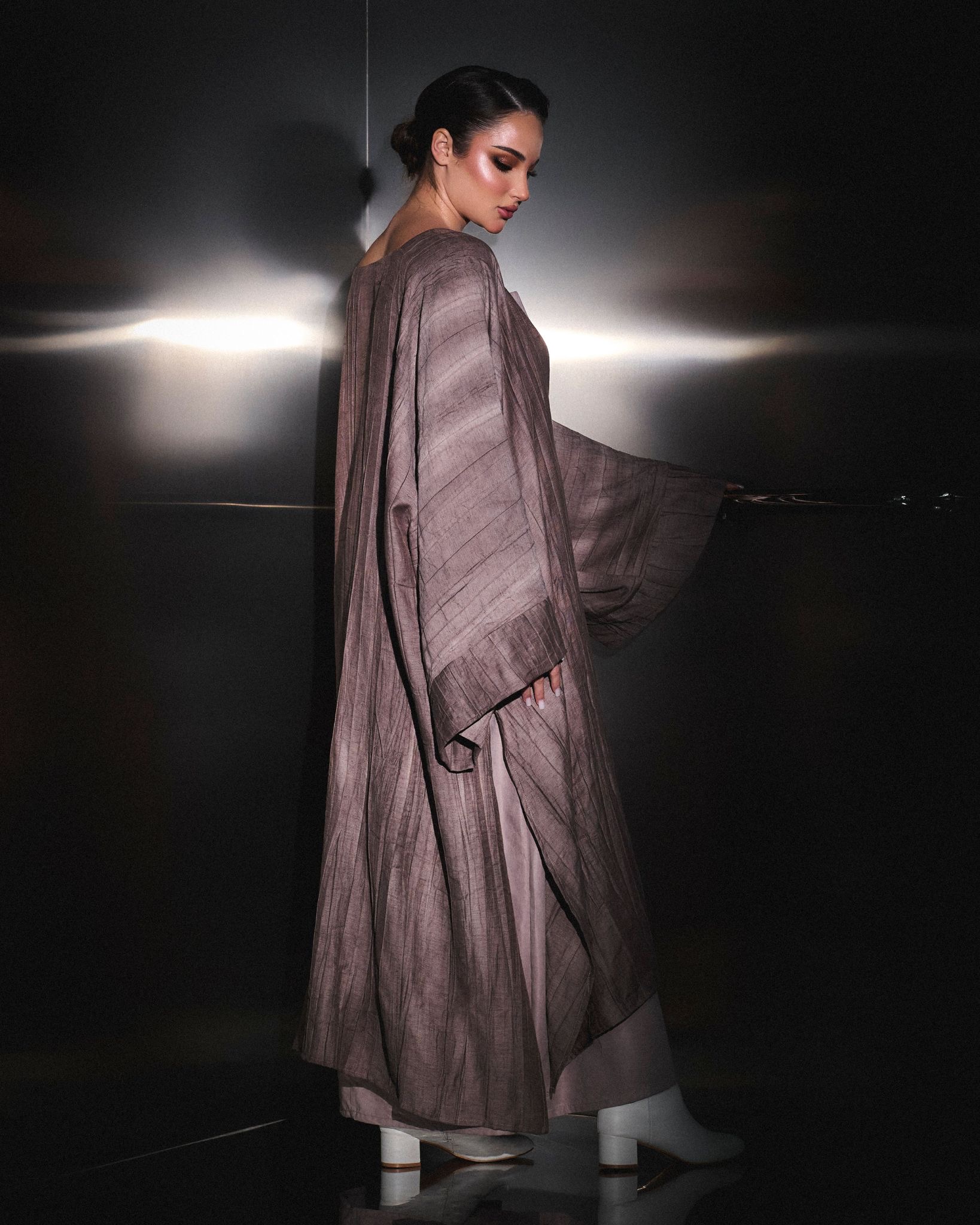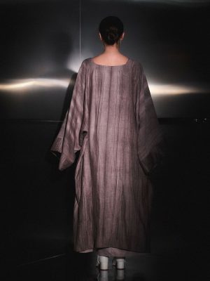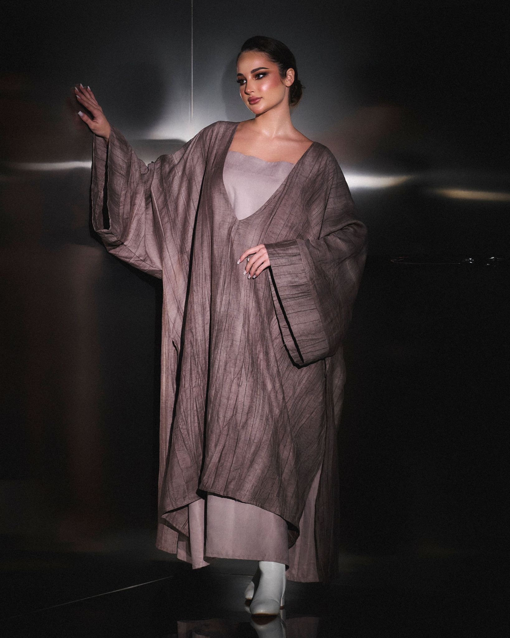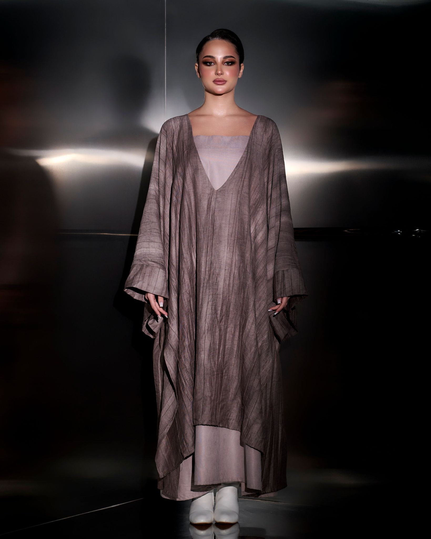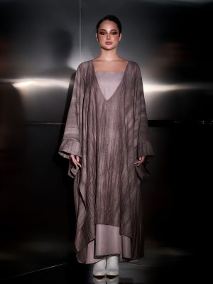 “A unique two-layer kaftan: the inner layer is a sleeveless suede dress, and the outer layer is a wide cotton dress with long, flowy sleeves.