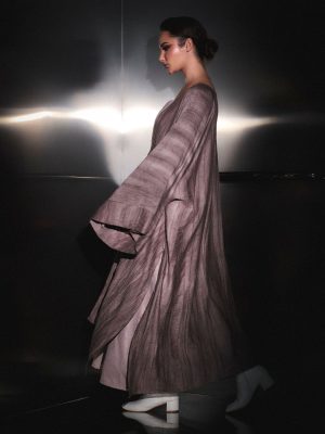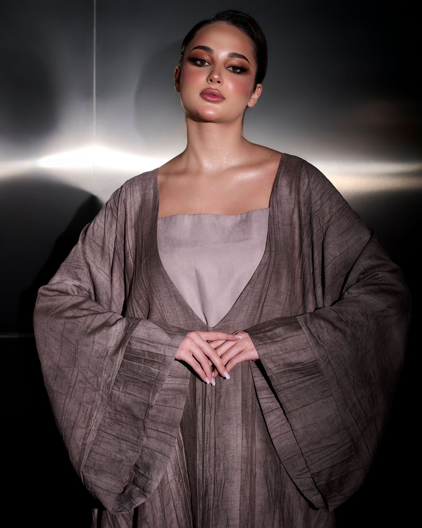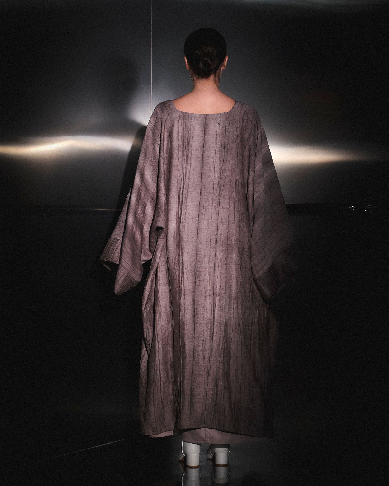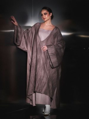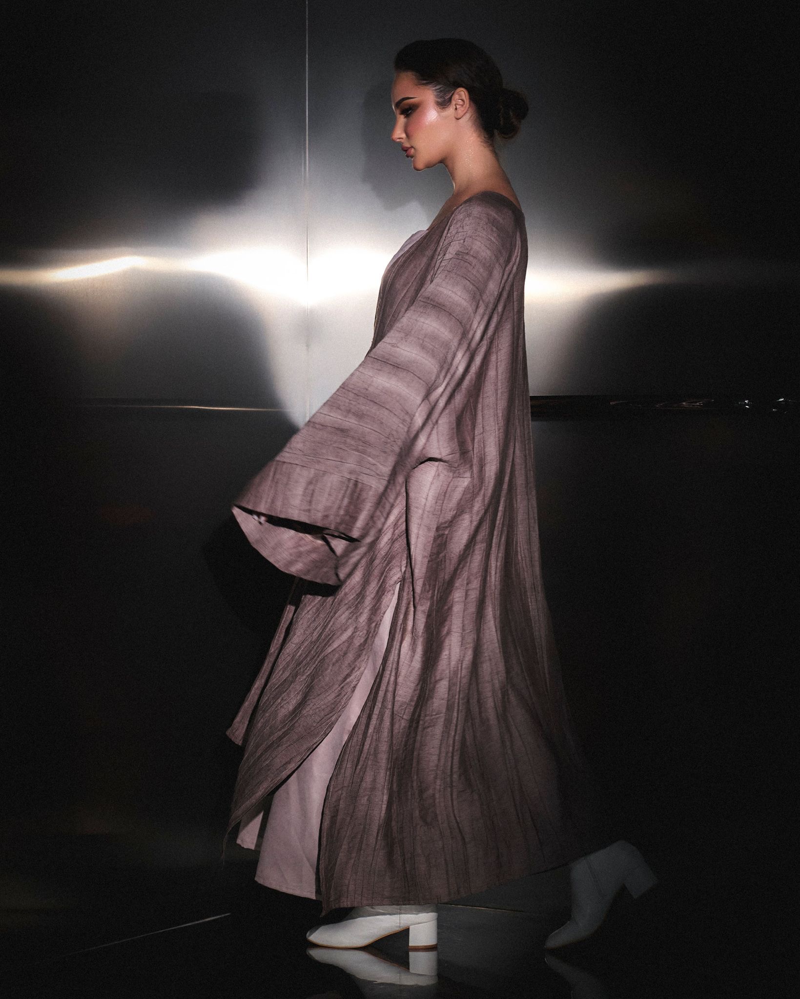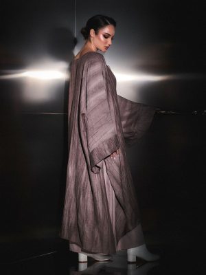 “A unique two-layer kaftan: the inner layer is a sleeveless suede dress, and the outer layer is a wide cotton dress with long, flowy sleeves.